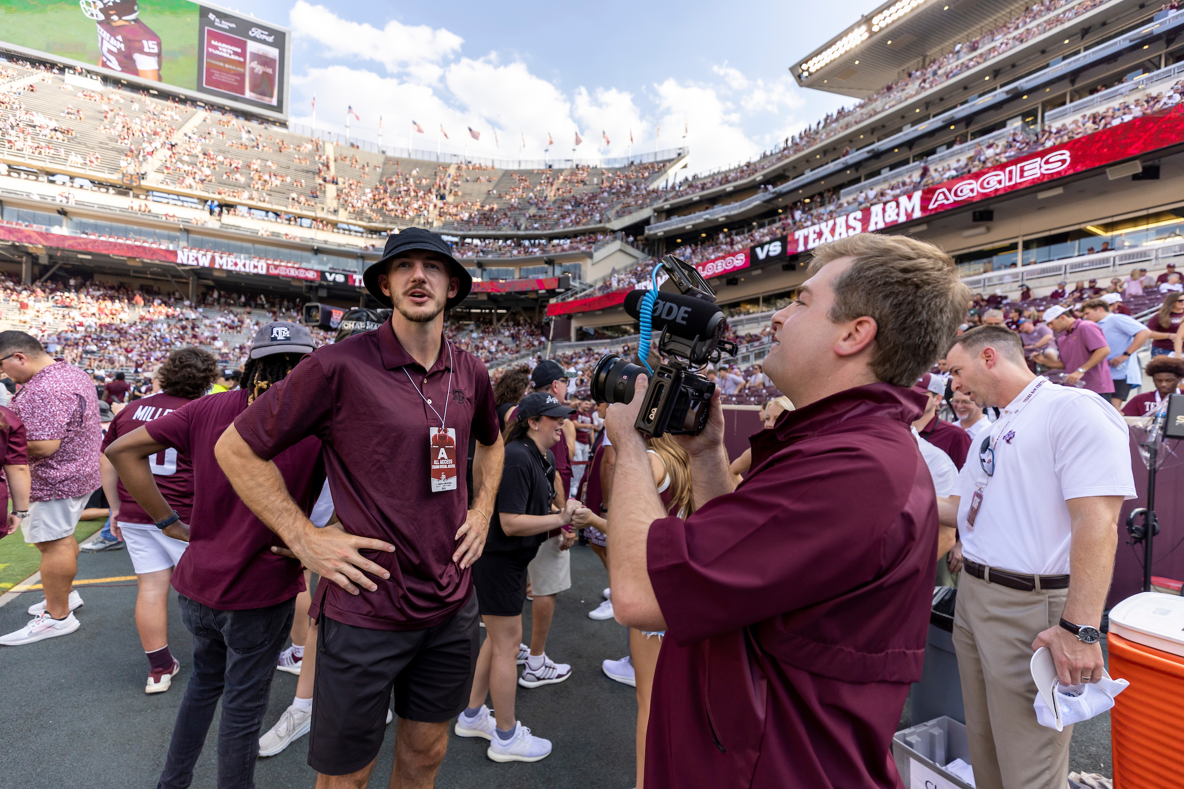 COLLEGE STATION, TX – September 02, 2023 – Alex Caruso and Clay Bollinger during the Football game between the New Mexico Lobos and the Texas A&M Aggies at Kyle Field in College Station, TX. Photo By Craig Bisacre/Texas A&M Athletics
